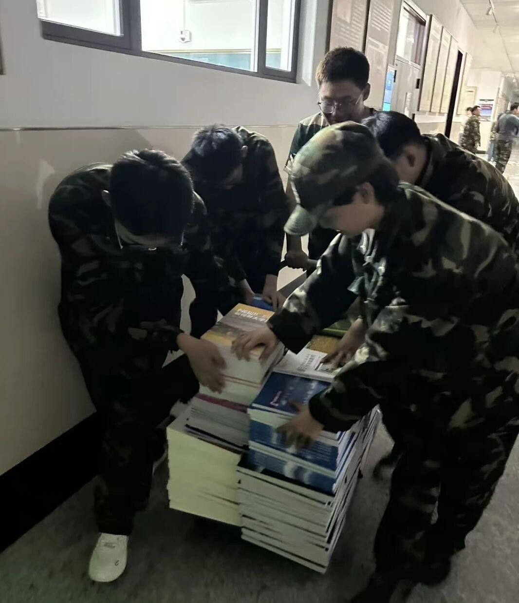 训练间隙,在教学楼的走廊里,总有这样的画面:几名新生合力搬运教材,迷彩服的颜色因汗水而显得更深,他们却在相视一笑中,把“集体”二字刻进了心里。这是军训里的另一重修行—在协作中懂得责任与担当。
