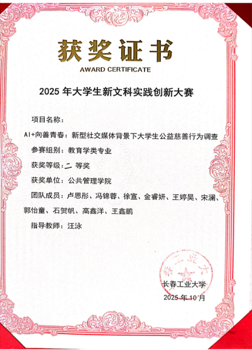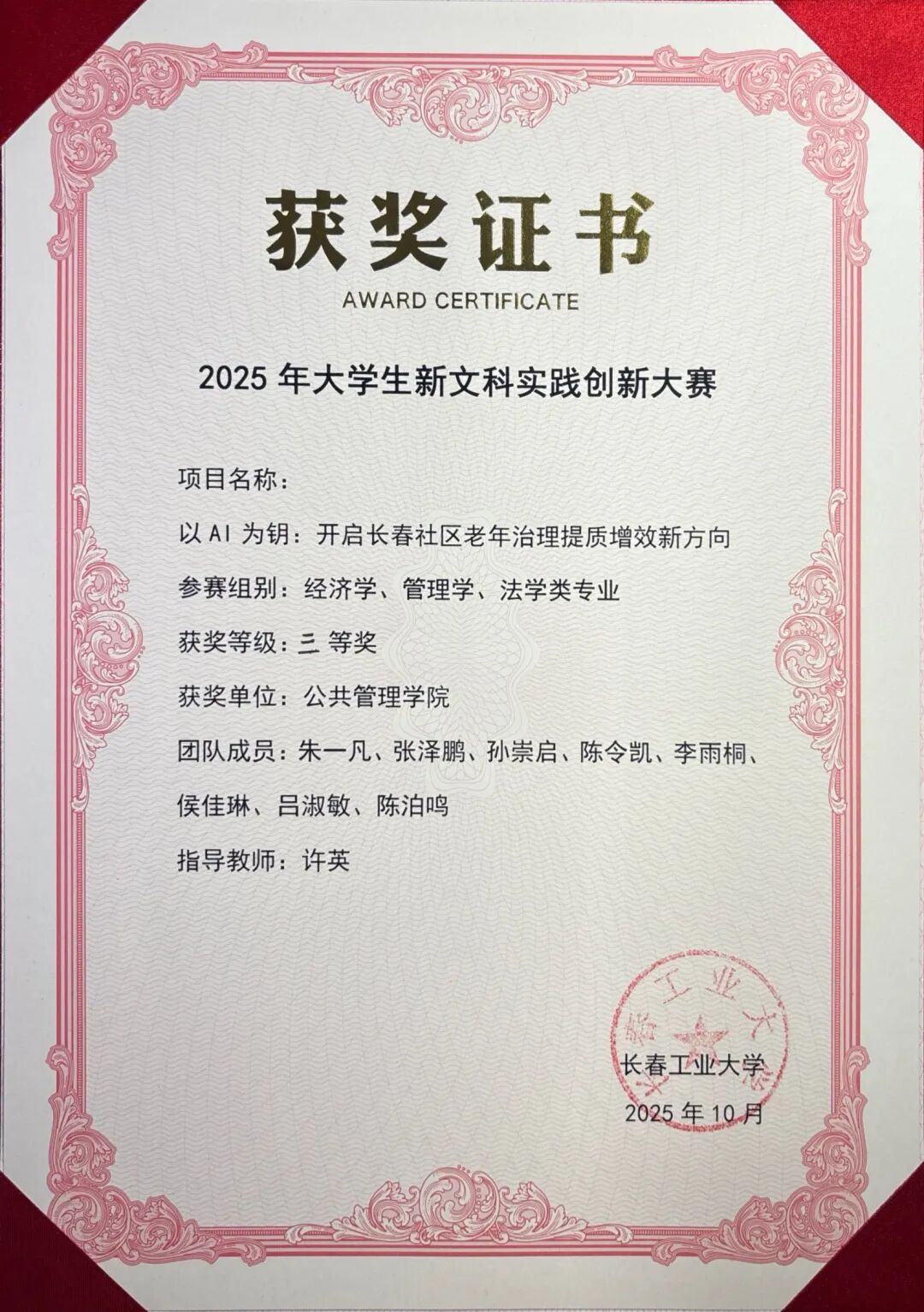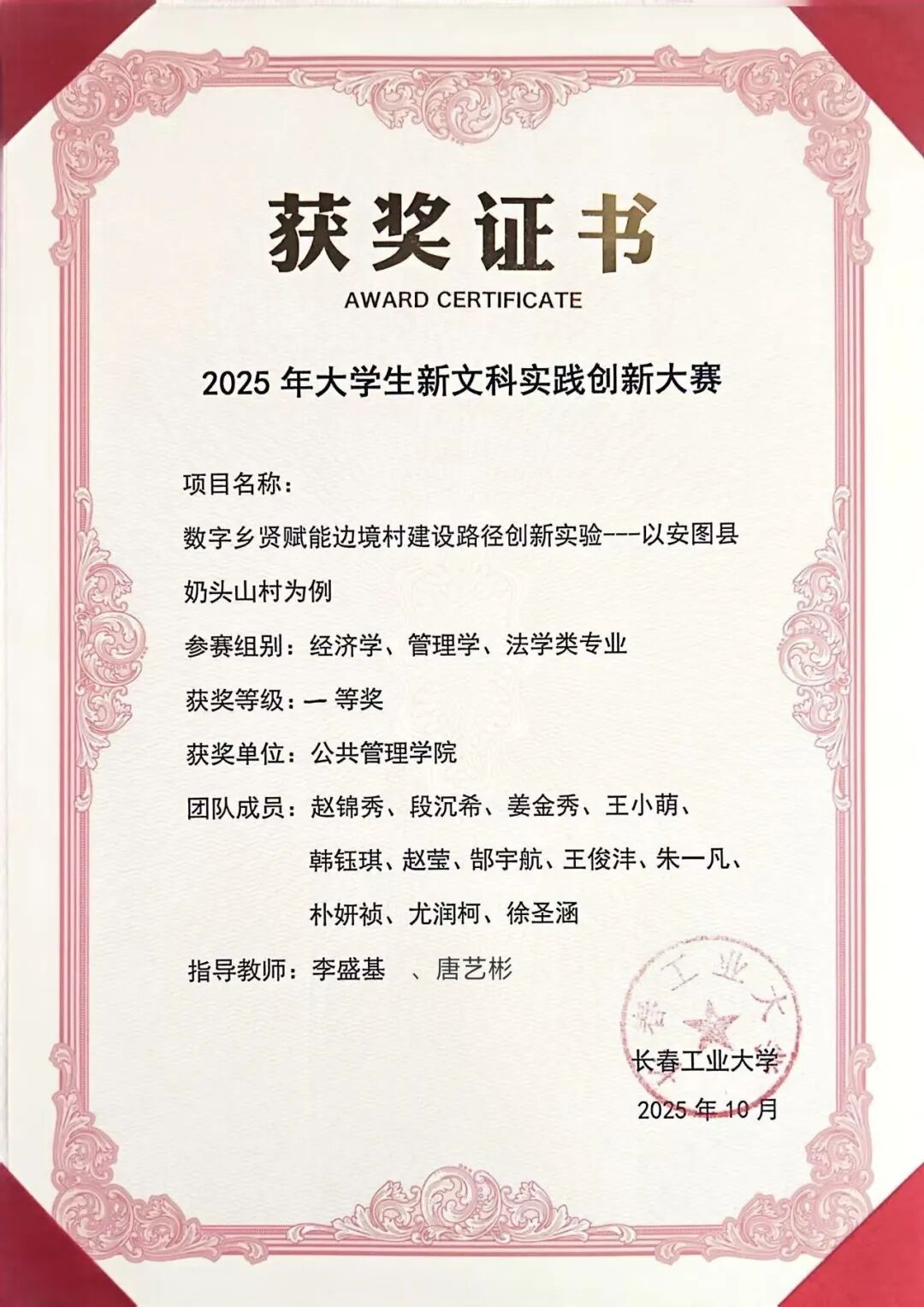 热烈祝贺我院学子在2025年大学生新文科实践创新大赛中凭借扎实的专业素养与创新实践能力,斩获佳绩,充分展现了公管学子在新文科领域的实践创新风采!