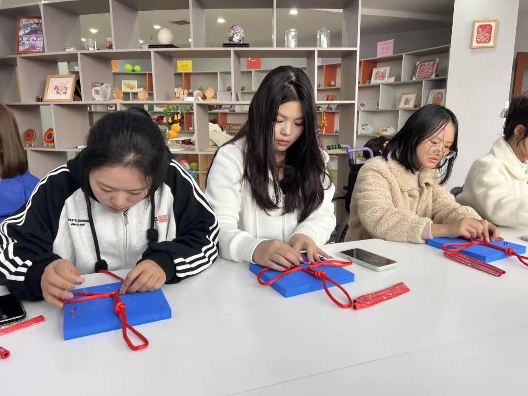 益乐工坊内,陈列着残障手艺人创作的各类中国结作品—从传统“吉祥结”到创新“盘长结”,红绳交错间满是匠心温度。同学们在总会工作人员的带领下参观展品,深刻感受非遗工艺与助残初心的结合,对接下来的中国结编织体验充满热情。