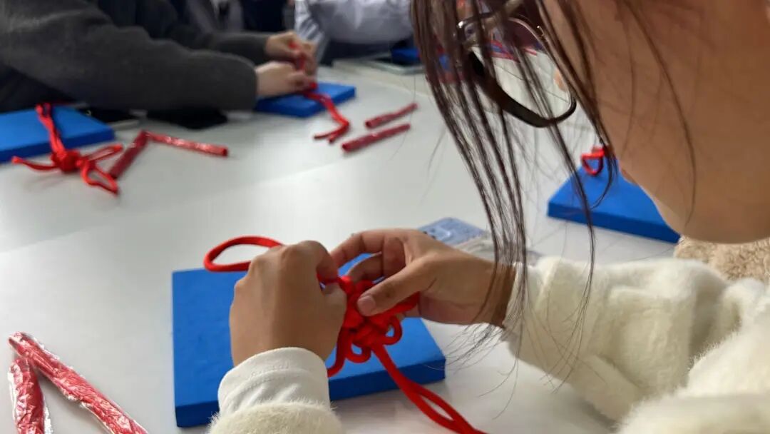 在专业老师的指导下,同学们从最基础的“平结”学起:指尖穿梭于红绳之间,反复摸索绳结的松紧力度与编织逻辑。当一个个完整的中国结在手中成型,同学们切实收获了成功的喜悦。
