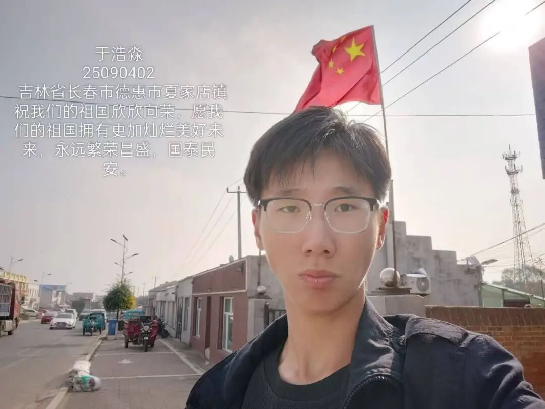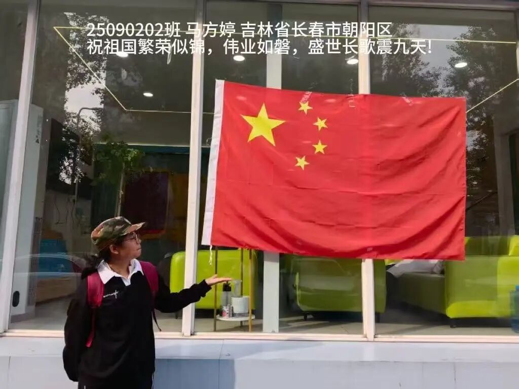 照片中,同学们手持国旗,在校园、家乡街头、旅行途中纷纷拍下照片。有的以教学楼为背景,与国旗并肩而立;有的绽开笑容,用青春姿态致敬祖国;还有的与家人共同出镜,让爱国情怀在家庭互动中传承。一张张照片里,国旗的鲜红与同学们的笑容交相辉映,洋溢着满满的自豪感。