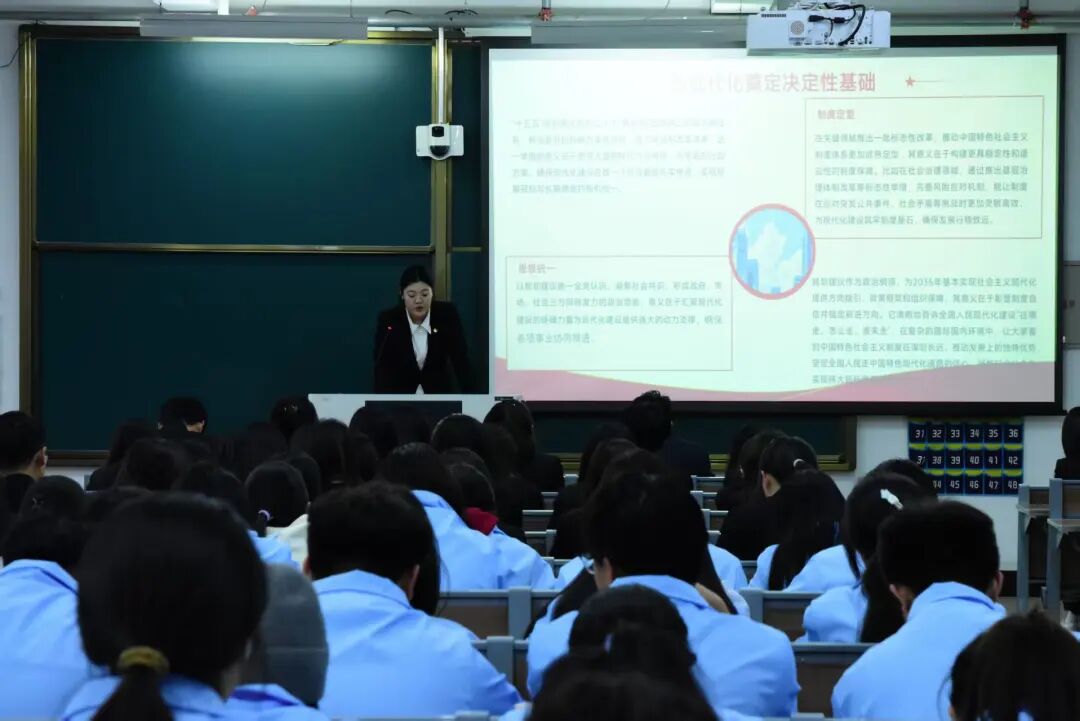 活动中,主讲人围绕 “坚持党的全面领导”“坚持人民至上”“坚持全面深化改革” 等事关国家发展全局的基本原则展开深入解读,系统梳理了“十五五”规划的时代意义,帮助同学们进一步理解其在推进社会主义现代化建设进程中的战略定位。