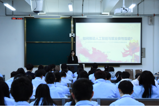 本次学习聚焦“人工智能与就业良性互动”主题。主讲人从人工智能与就业的时代命题切入,系统剖析技术变革带来的机遇与挑战,并重点讲解强化就业优先导向、提升劳动者适应能力、创新权益保障等实践路径,引导同学们深入思考如何在技术进步中保障民生福祉,实现协同发展。
