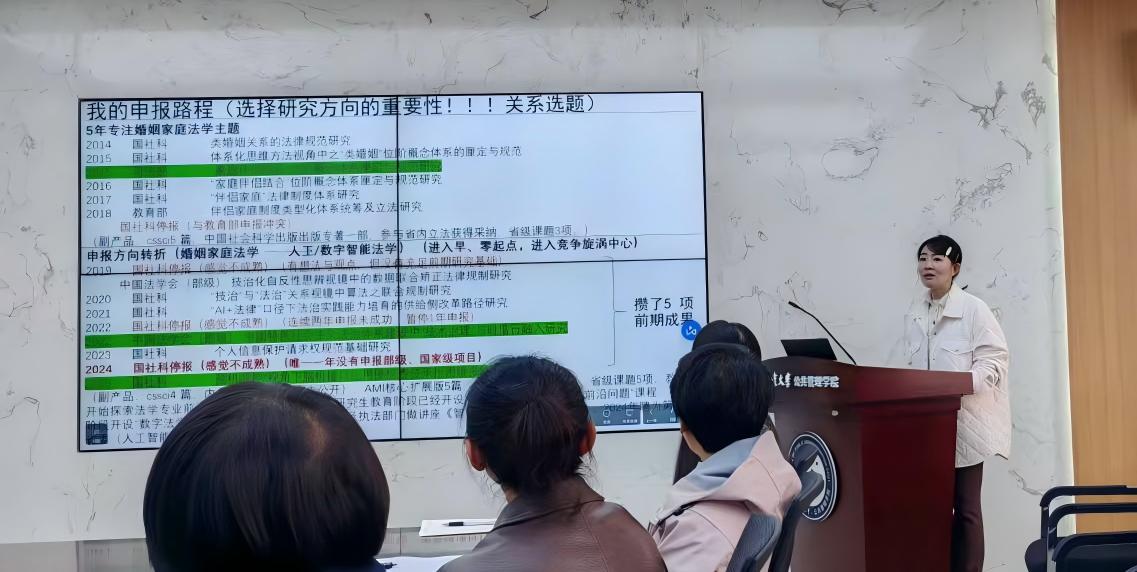 法学系刘蓓教授申报2025年国家社科基金一般项目并成功立项,其选题“‘脑机混控’视角下脑机接口应用侵权责任承担困境多维破解研究”融合技术变革与法学研究,体现一定的学科交叉视角。本次活动中,刘蓓教授介绍了其项目申报情况,梳理了国社科项目的准备、选题和论证等注意事项并提出申报建议。刘蓓教授认为,要明确国家社科基金项目的科研定位和追求,密切关注国家战略规划,分析技术变革引发的社会需求,持续推进研究准备、夯实研究基础,用批判性思维寻求研究突破,并且规范、精心地进行项目论证。刘蓓教授的分享,鲜活而深刻,具有较强的启示性,引发与会者深思。围绕国社科申报尤其是选题事项,参会教师进行了交流和讨论。