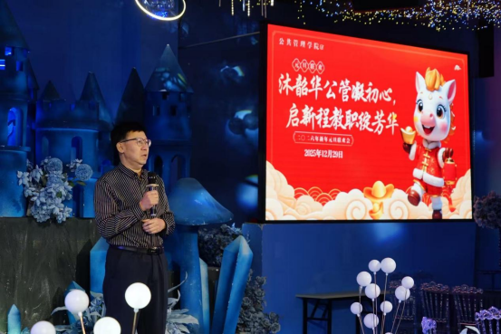 联欢会由学院党委书记于洪致辞,他向全体教职工致以新年问候,回顾了过去一年学院在各方面取得的成就,并勉励大家在新的一年中凝心聚力、携手前行。随后,优秀校友张宏图上台分享了他与学院的故事,表达了对母校深切的感激与祝福,寄语师生们继续发扬公管精神,共创美好未来。