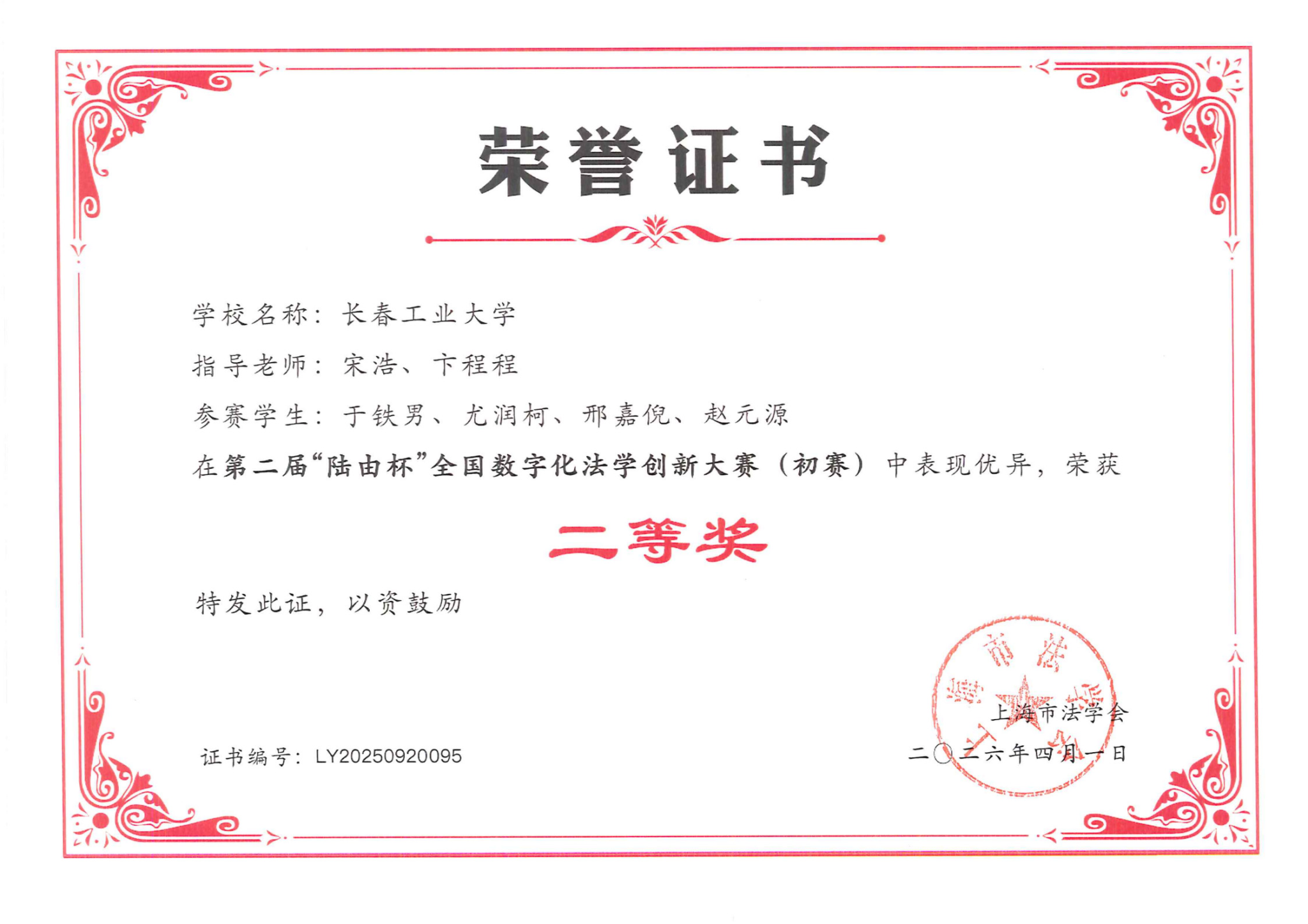 长春工业大学团队由宋浩、卞程程两位老师担任指导,成员包括于铁男、尤润柯、邢嘉倪、赵元源四位同学。在备赛过程中,团队紧扣数字化法学前沿趋势,结合法学理论与数字工具,提出具有创新性与可行性的解决方案,最终在初赛中脱颖而出,荣获二等奖。
